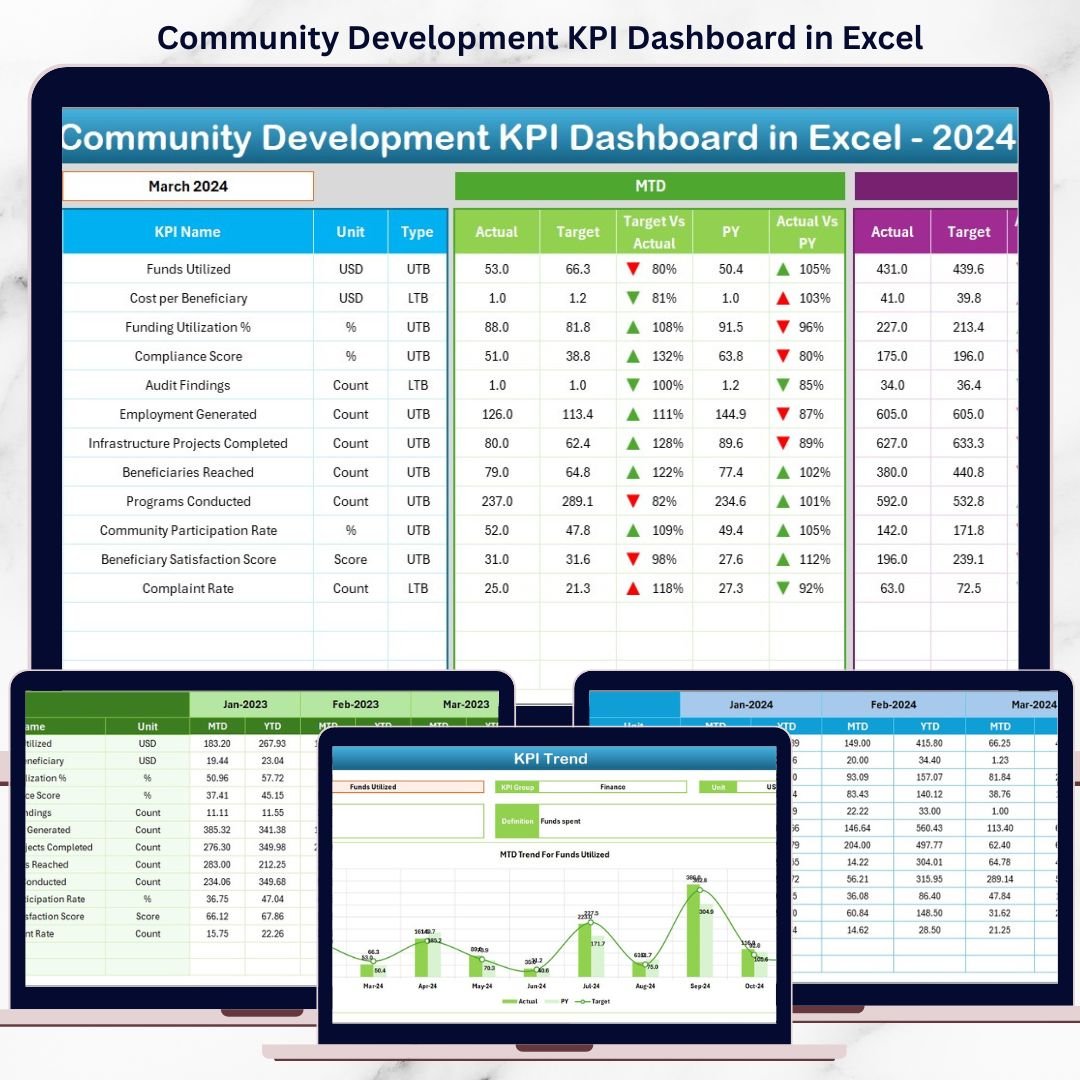 This ready-to-use Excel dashboard transforms raw community development data into clear, structured, and actionable insights. Instead of spending hours compiling reports, teams can instantly track Month-to-Date (MTD) and Year-to-Date (YTD) performance from one centralized dashboard. Because the dashboard is built entirely in Excel, it remains easy to use, flexible, and accessible—even for non-technical users.