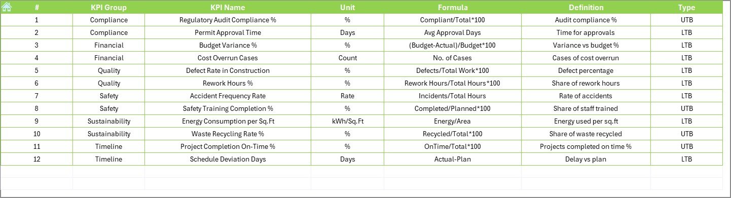 7️⃣ KPI Definition Sheet – Clear descriptions, formulas, and KPI types (UTB/LTB).