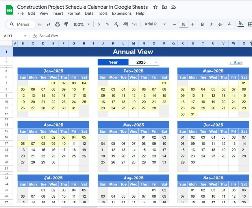 📌 Annual View Sheet – Displays 12 months in a single view. Select the year, starting month, and starting day of the week to customize the calendar layout for your construction project timeline.