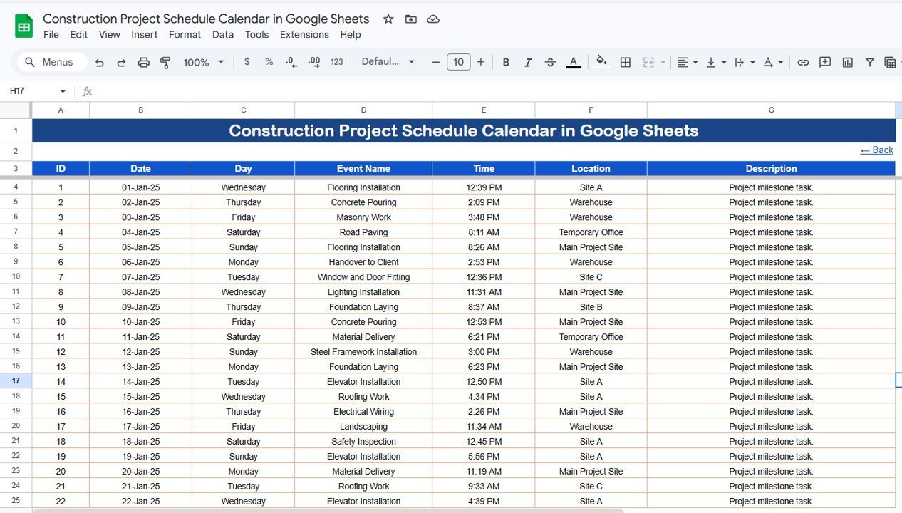 Each event captures 7 fields: ID (auto-generated), Date, Day (Sunday through Saturday), Event Name, Time, Location, and Description. This gives you enough detail to track any construction activity from site inspections to permit submissions to subcontractor meetings.Construction Project Schedule Calendar in Google Sheets