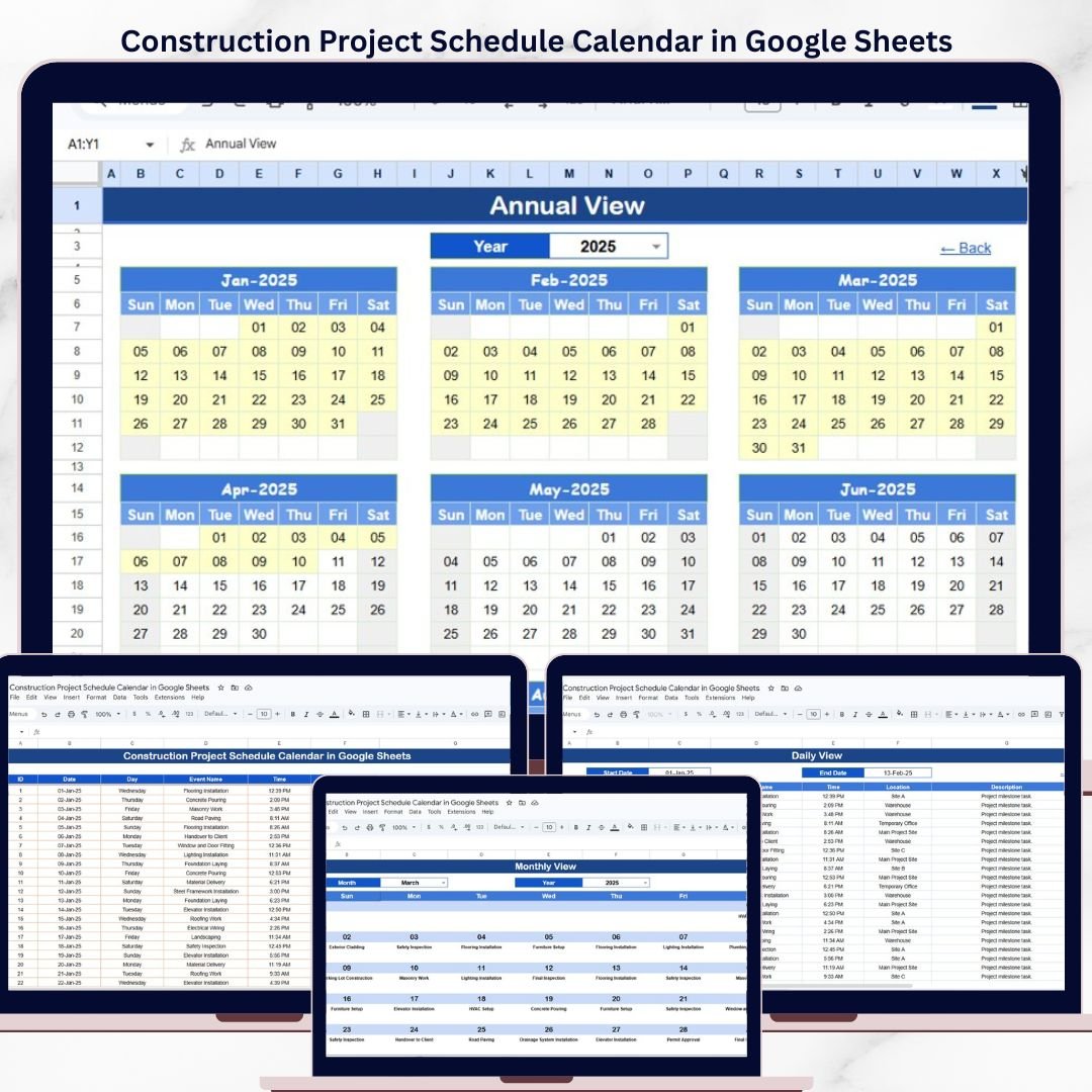 The Construction Project Schedule Calendar in Google Sheets organizes construction activities across 5 interactive worksheets with annual, monthly, and daily calendar views plus a centralized events database. Setup takes under 5 minutes — just paste your project events and every view updates automatically.
