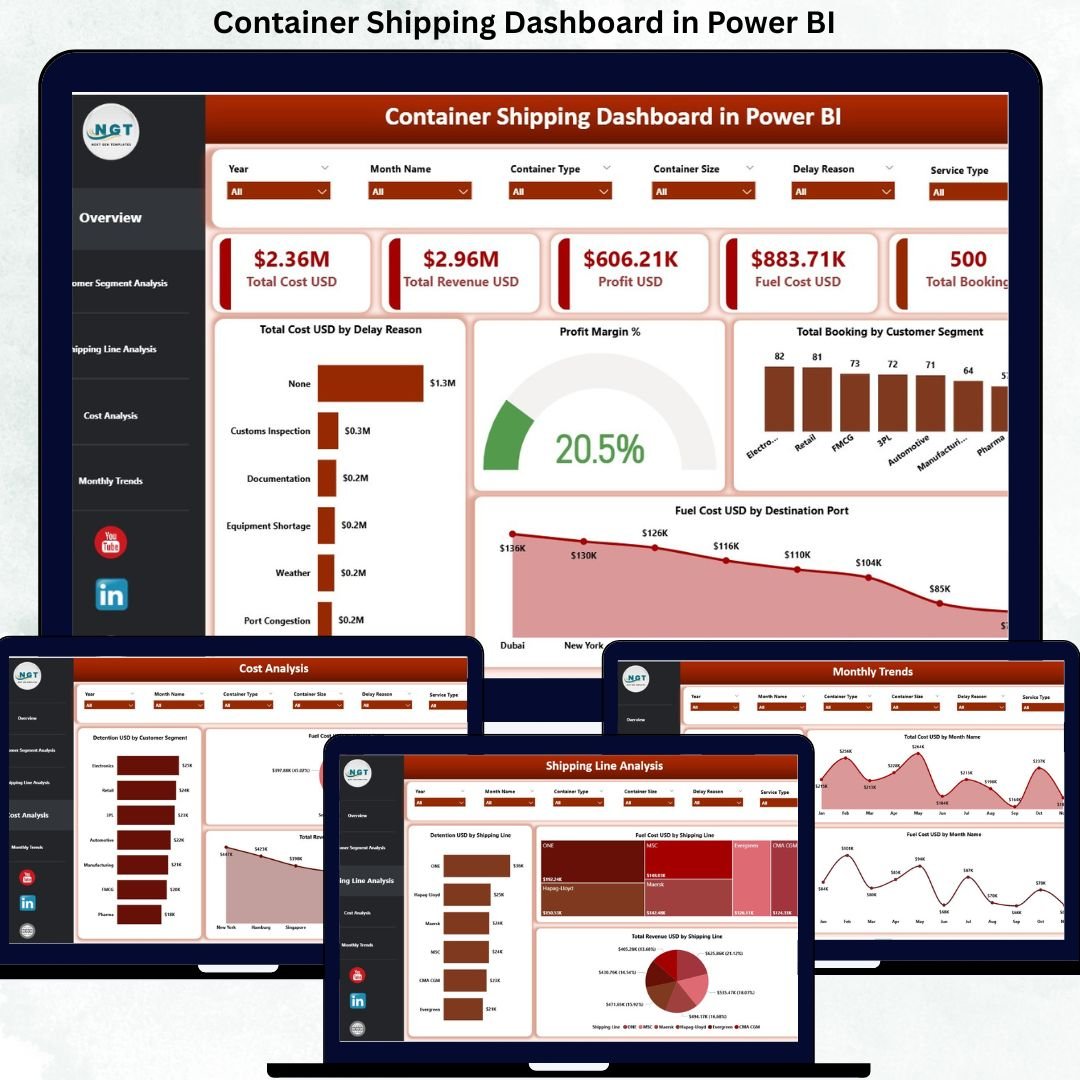 Container Shipping Dashboard in Power BI This ready-to-use Power BI dashboard converts complex container shipping data into clear KPIs, interactive visuals, and actionable insights. Instead of reviewing multiple files and manual reports, operations teams, finance leaders, and executives gain one centralized, real-time view of costs, revenue, fuel usage, profit margins, and bookings. As a result, shipping organizations respond faster, reduce inefficiencies, and protect profitability.