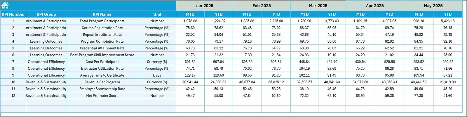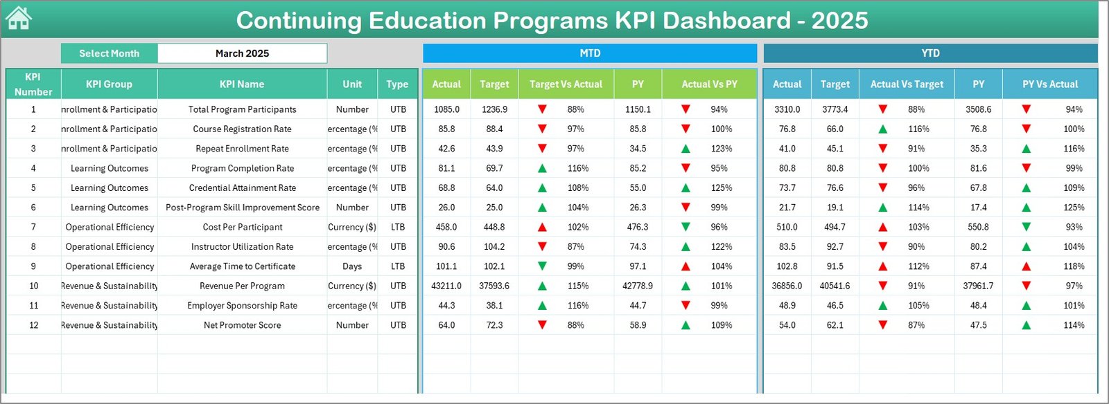 📊 Comprehensive KPI Scorecards — Track all your continuing education metrics at a glance including Enrollment Rate, Completion Rate, Certification Pass Rate, Learner Satisfaction Score, Revenue per Program, Cost per Learner, Instructor Utilization Rate, and many more through dynamic MTD and YTD scorecards with Target vs Actual and Previous Year vs Actual comparisons highlighted by conditional formatting arrows.