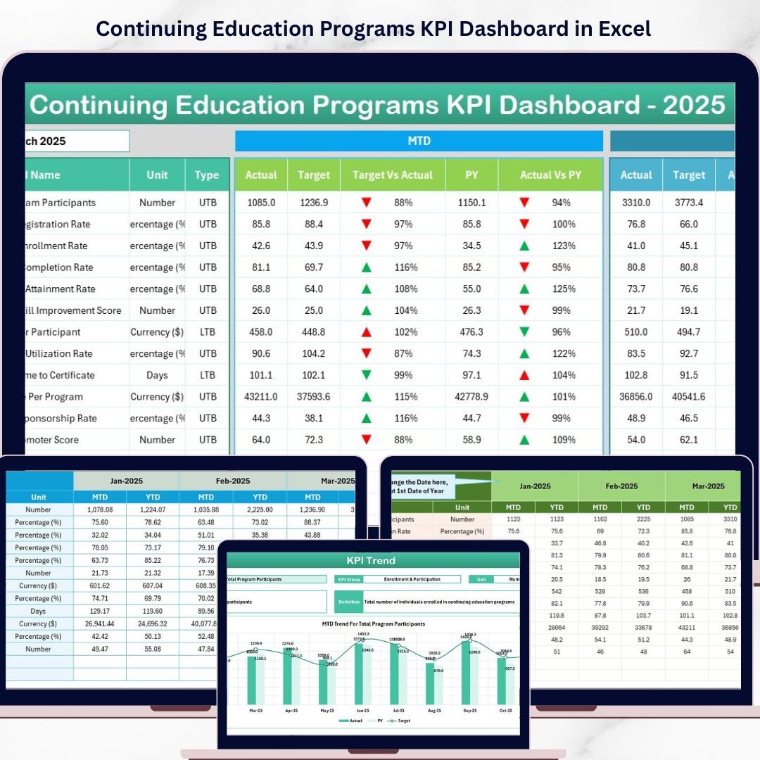 If you are managing continuing education programs and looking for a smarter way to consolidate enrollment data, completion metrics, revenue figures, and learner satisfaction scores into a single reporting view, this Continuing Education Programs KPI Dashboard in Excel is your ultimate solution. Simply input your actual numbers alongside targets and previous year data, and the dashboard automatically calculates MTD and YTD comparisons with intuitive conditional formatting arrows — giving you instant clarity on which KPIs are on track and which need attention.Continuing Education Programs KPI Dashboard in Excel