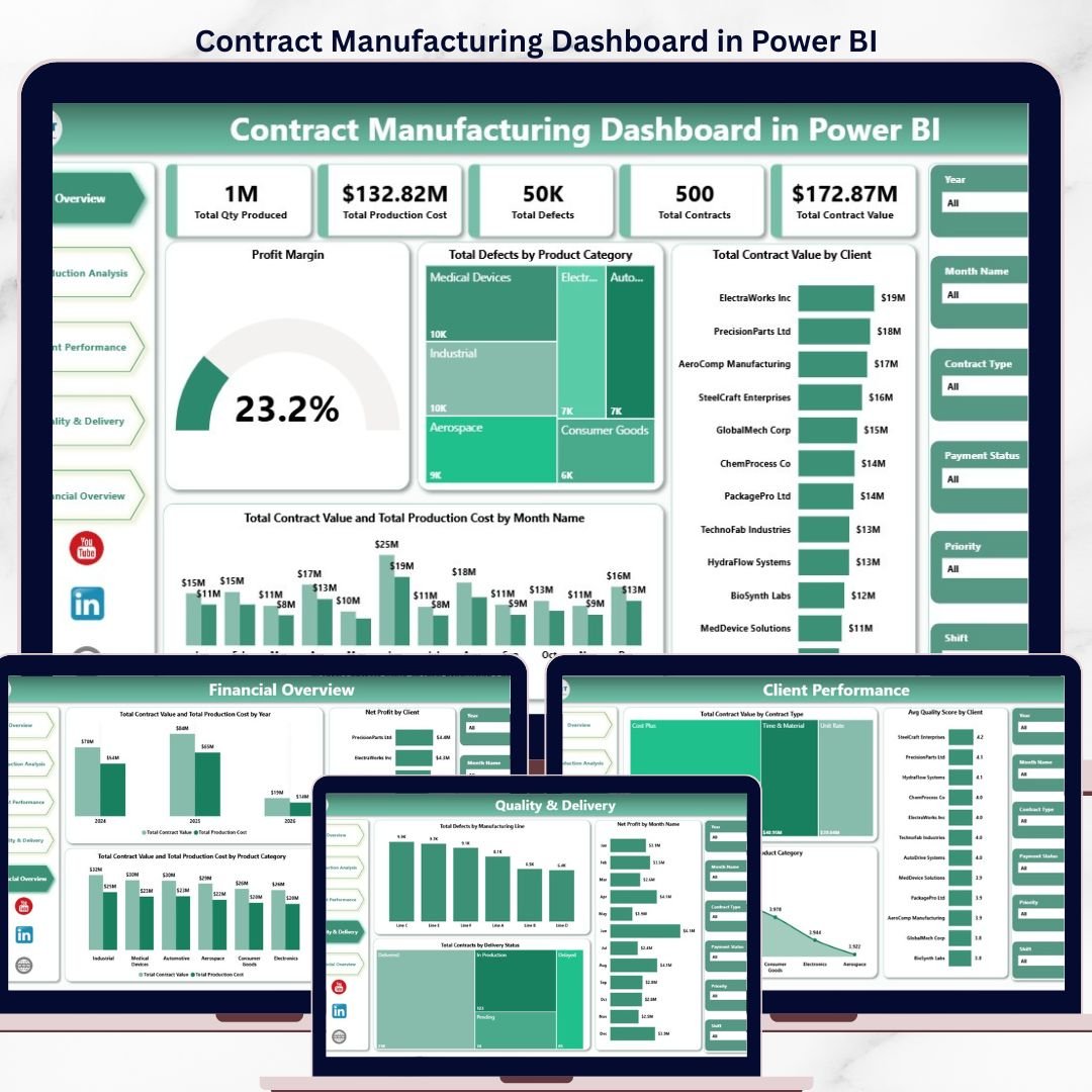 🏭 Contract Manufacturing Specific Metrics — Profit Margin, Avg Quality Score by Client, Total Defects by Manufacturing Line, and Net Profit by Client are all built specifically for contract manufacturers, OEM partners, and private-label producers. This dashboard tracks 5 headline KPIs across 5 analytical views.