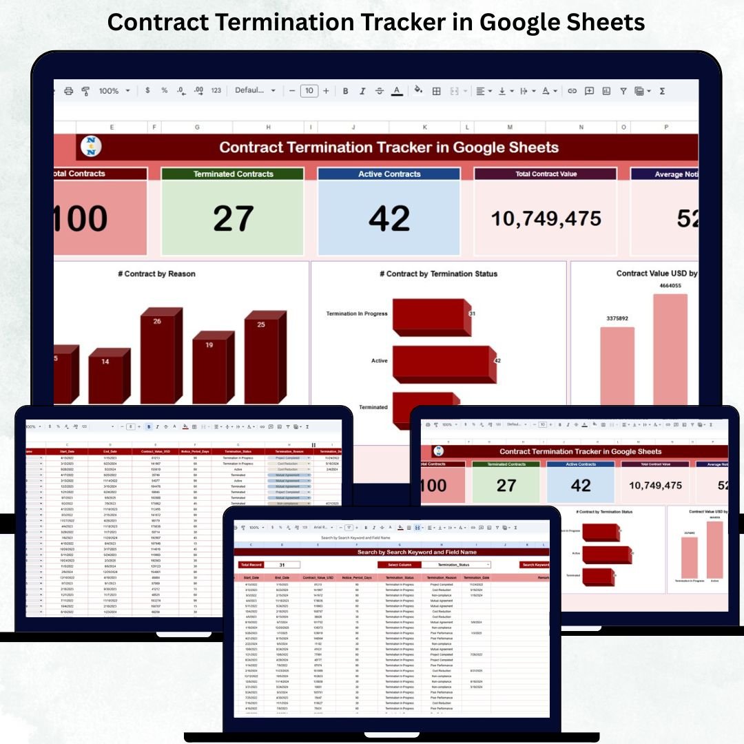 This ready-to-use Google Sheets tracker centralizes all contract information, displays key metrics, visualizes termination patterns, and helps teams manage contract lifecycles with complete clarity. With automatic charts, powerful search features, KPI cards, and a clean data entry structure, this tracker gives businesses the exact control they need to stay compliant and reduce operational risk.Contract Termination Tracker in Google Sheets