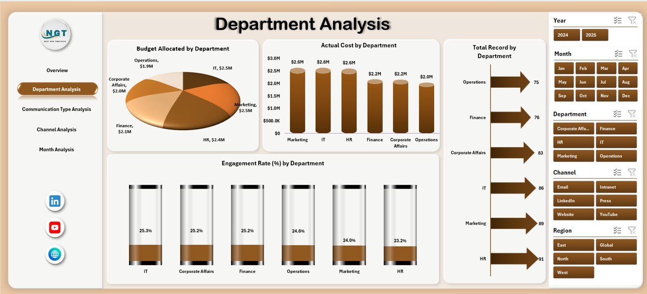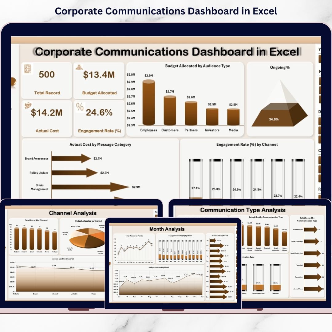 That’s exactly why you need the Corporate Communications Dashboard in Excel — a ready-to-use, interactive dashboard designed to track budget allocation, actual cost, engagement rate, and campaign progress across departments, channels, audience types, and months.