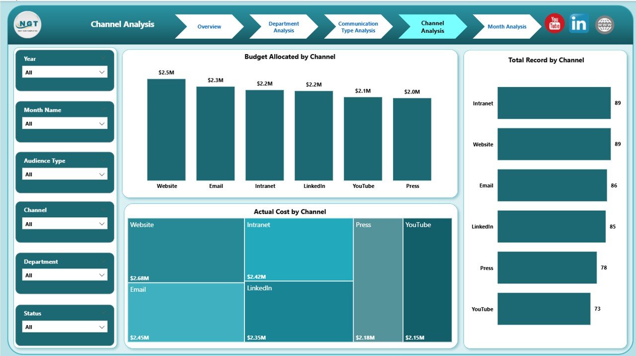 Filter by Month, Department, Channel, Audience Type, and Communication Type instantly.