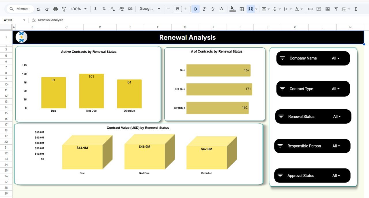 As a result, managers frequently struggle to track contract status, monitor renewals, evaluate approval performance, and analyze financial exposure related to contracts.Corporate Contract Management Dashboard in Google Sheets