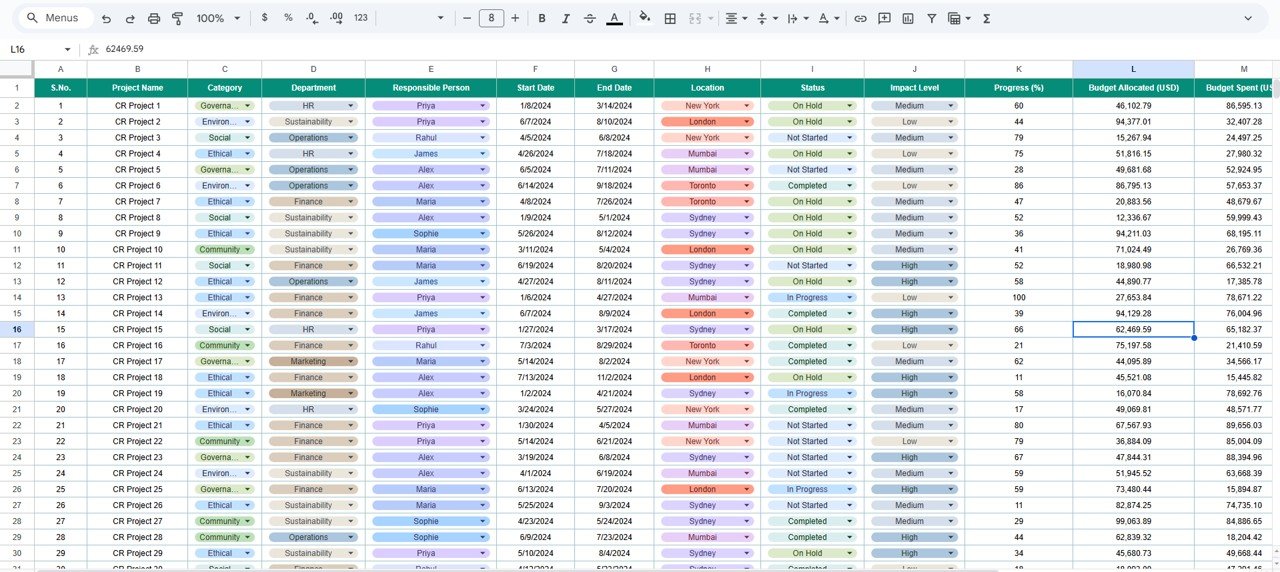 This ready-to-use tracker helps organizations centralize corporate impact projects, monitor budgets, track impact levels, and analyze performance across departments, locations, and owners—all in one clean and dynamic Google Sheets file. Because it runs in Google Sheets, teams collaborate easily and update progress in real time without expensive ESG or BI software.