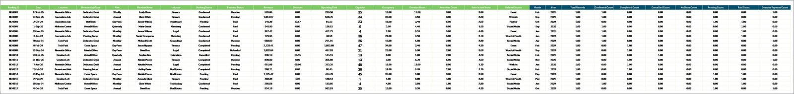 The raw data layer. Replace the sample rows with your own booking records in the same column format (Date, Location, Member, Membership Type, Plan, Industry, Referral Source, Payment Status, Duration Hours, Revenue, Operating Cost, Discount, Satisfaction, Capacity).
