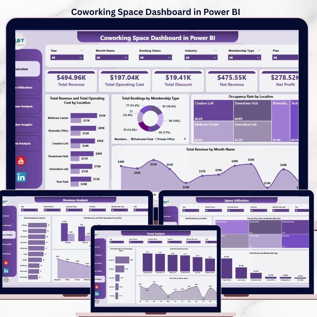 The Coworking Space Dashboard in Power BI tracks 5 headline KPIs on the Overview page — Total Revenue, Total Operating Cost, Total Discount, Net Revenue, and Net Profit — plus 14 supporting visuals across Space Utilization, Revenue Analysis, Member Insights, and Trend Analysis pages. Every metric refreshes in under 1 second when slicers are applied.