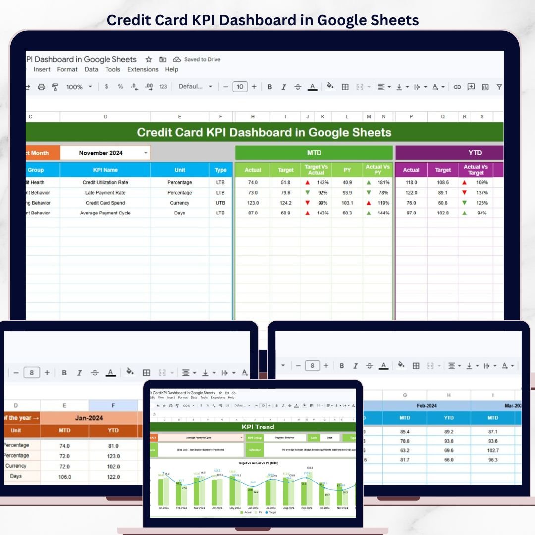 The Credit Card KPI Dashboard in Google Sheets tracks credit card performance across 6 interactive worksheets, with MTD and YTD comparisons against targets and previous-year benchmarks. It includes trend charts for every KPI, conditional-formatting arrows for instant status checks, and built-in LTB/UTB logic. Setup takes under 10 minutes — replace the sample data and the entire dashboard updates automatically.Credit Card KPI Dashboard in Google Sheets