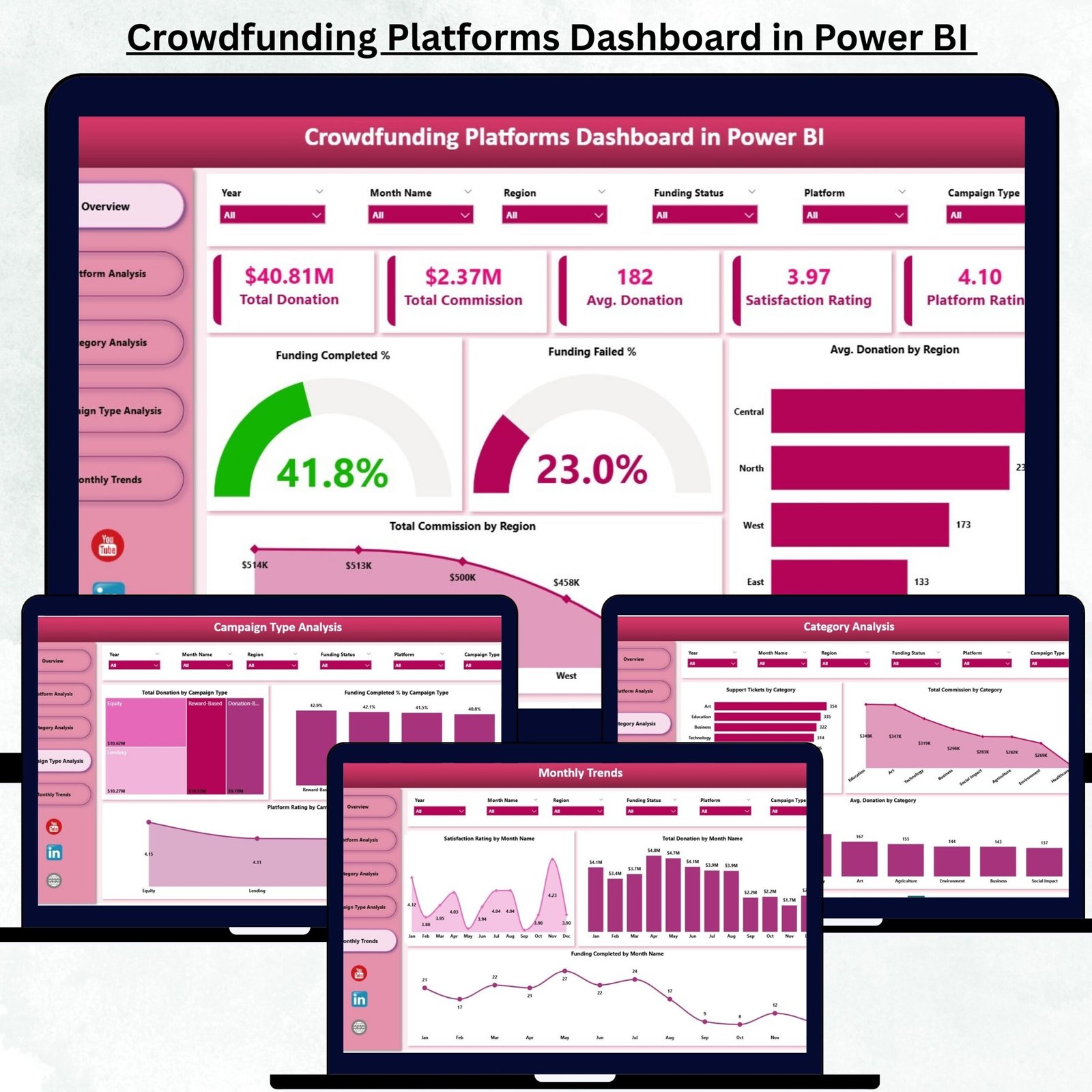 Crowdfunding Platforms Dashboard in Power BI This dashboard transforms raw donation and campaign data into meaningful insights using automated visuals, KPI cards, slicers, and dynamic charts. Crowdfunding Platforms Dashboard in Power BI Whether you run a crowdfunding company, manage fundraising campaigns, or analyze donor trends, this dashboard gives you complete clarity in seconds. Crowdfunding Platforms Dashboard in Power BI, it helps you measure funding success, track commissions, evaluate campaign categories, study regional performance, and analyze monthly behaviors.