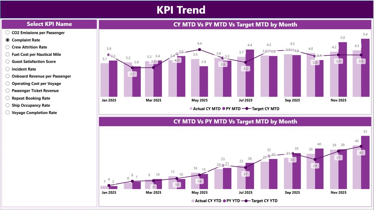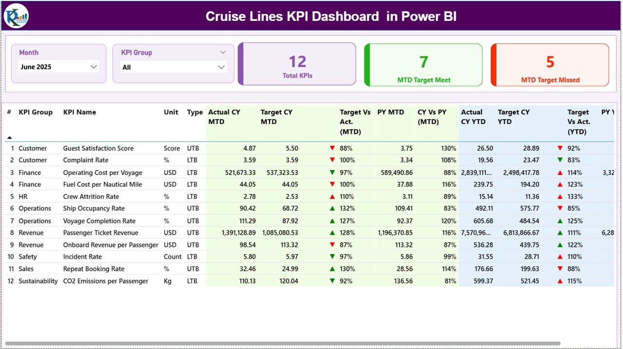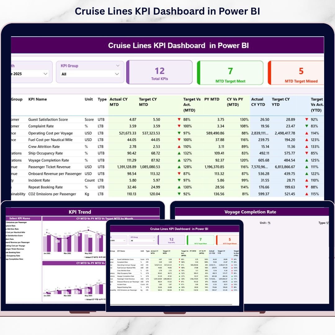 Cruise Lines KPI Dashboard in Power BI The Cruise Lines KPI Dashboard in Power BI is a ready-to-use, interactive analytics solution designed specifically to track and analyze key performance indicators for cruise line operations. Instead of reviewing multiple disconnected reports, cruise companies can monitor Month-to-Date (MTD) and Year-to-Date (YTD) performance, compare Actual vs Target vs Previous Year values, and analyze trends using dynamic visuals 📊.