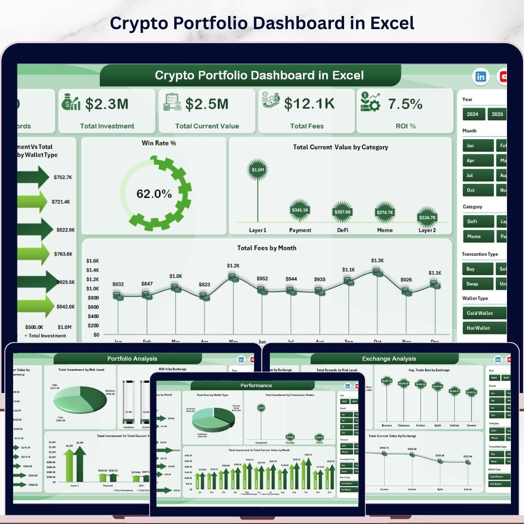 Crypto Portfolio Dashboard in Excel is a professionally designed cryptocurrency analytics template built for crypto investors, traders, portfolio managers, and finance enthusiasts who want to monitor Total Investment, Total Current Value, Total Fees, and ROI % from a single, powerful Excel dashboard. This template includes 5 interactive dashboard pages covering Overview, Portfolio Analysis, Performance, Exchange Analysis, and Risk Overview — making it one of the most comprehensive Excel Dashboard Templates available for crypto portfolio management.
