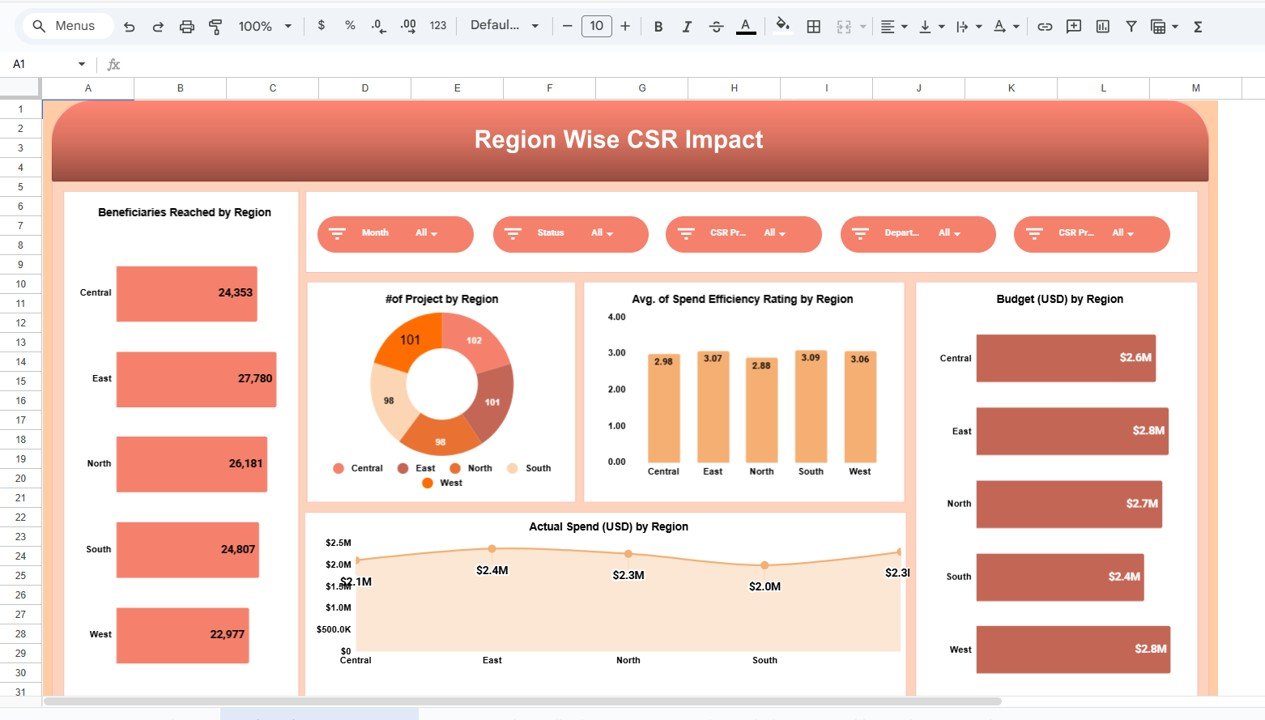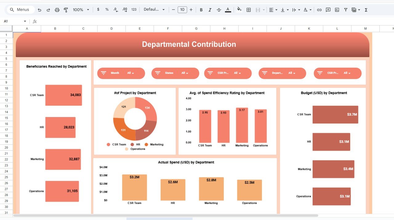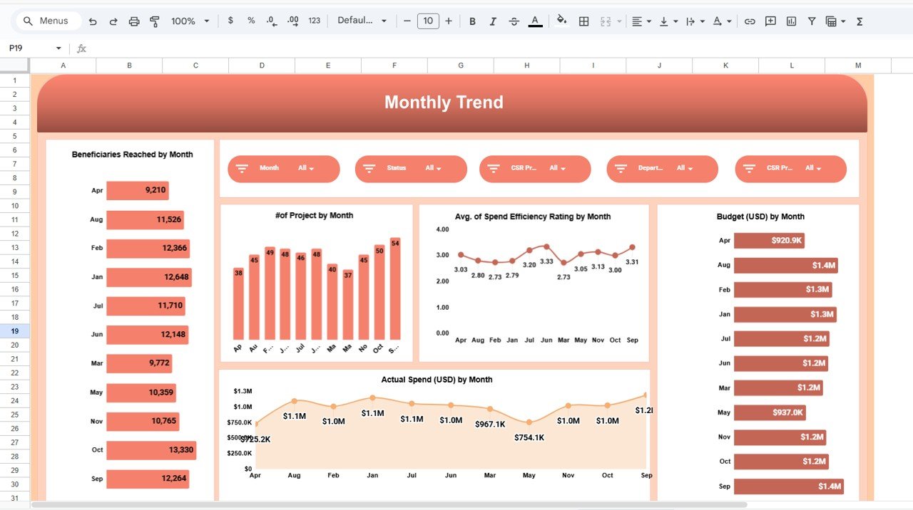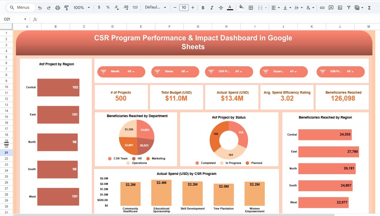 Because the dashboard is built entirely in Google Sheets, it supports real-time collaboration, easy updates, and instant filtering—without requiring technical skills or complex tools. As a result, CSR teams, ESG managers, and leadership can make data-driven decisions with confidence.CSR Program Performance & Impact Dashboard in Google Sheets