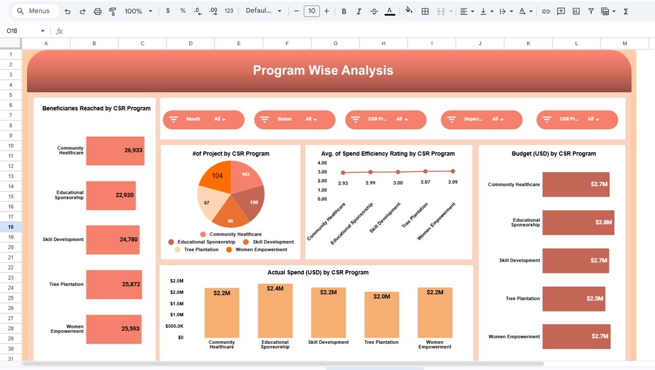Corporate Social Responsibility (CSR) programs play a vital role in building trust, sustainability, and long-term social impact. However, many organizations struggle to measure the true effectiveness of their CSR initiatives because data is scattered across multiple spreadsheets, reports, and manual trackers. As a result, leadership lacks visibility into budgets, beneficiaries, program efficiency, and overall impact.CSR Program Performance & Impact Dashboard in Google Sheets