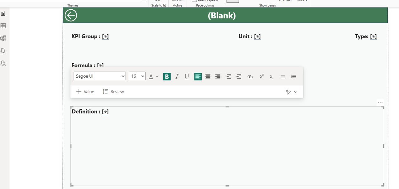 ✅ Drill-Through Functionality — Click any KPI to view its formula, type (LTB/UTB), and definition in detail.