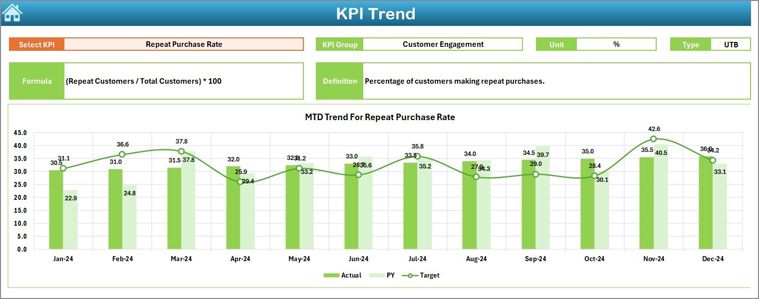 ✅ MTD & YTD Comparisons — Compare Actual vs Target and Current Year vs Previous Year for each KPI, highlighted with intuitive conditional formatting.