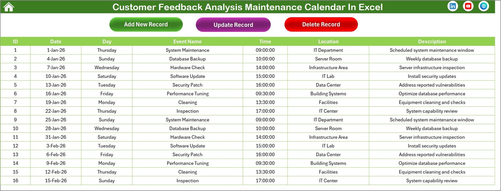 📅 Key Features of Customer Feedback Analysis Maintenance Calendar in Excel