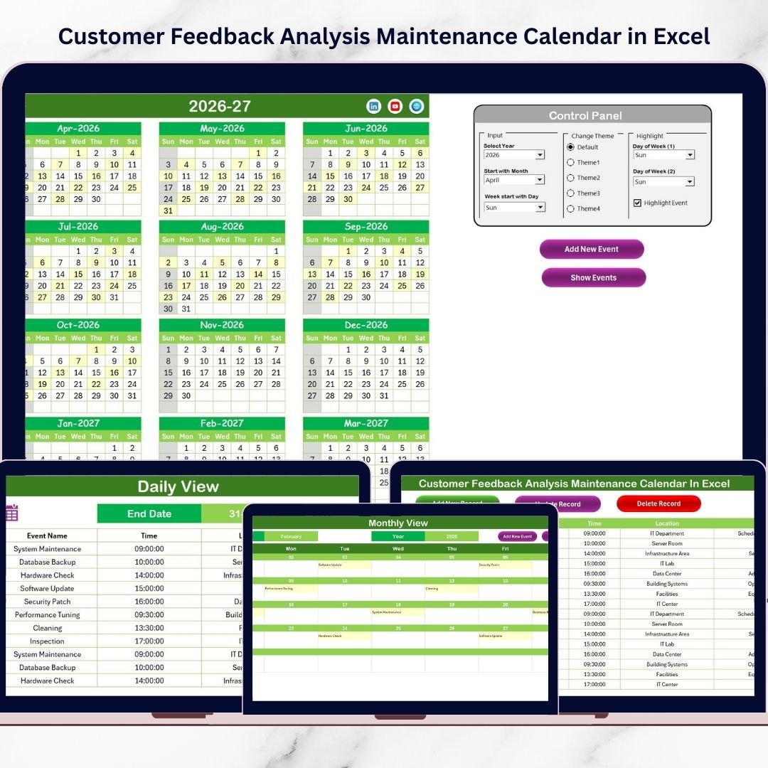 Customer feedback is one of the most valuable assets for any organization. Businesses collect feedback from surveys, product reviews, support tickets, social media comments, and direct customer interactions. Customer Feedback Analysis Maintenance Calendar in Excel However, collecting feedback alone is not enough. Organizations must regularly analyze this information to identify improvement opportunities and enhance customer experience.
