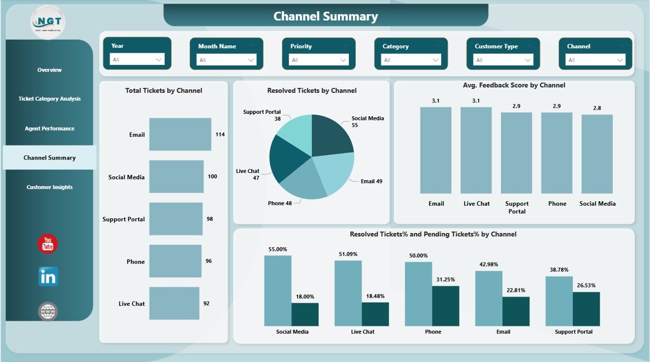 📞 Channel-wise performance – Optimize email, chat, phone, and portal support