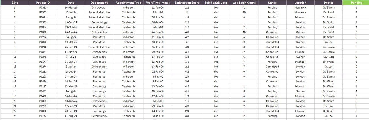 🗂️ 3. Data Sheet — paste your appointment log here in the same column structure (Date, Department, Appointment Type, Location, Status, Satisfaction Score, App Login flag). Every other sheet refreshes from this single source.
