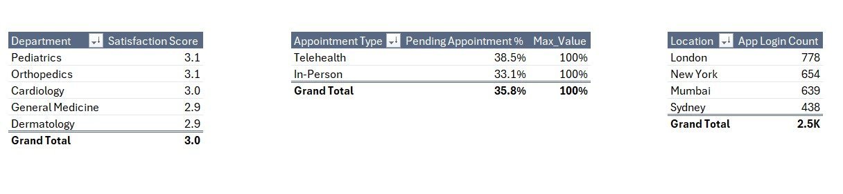 • 🔹 5 charts on the Summary page – Cancelled %, Satisfaction by Department, Pending % by Type, App Logins by Location, Appointments by Month