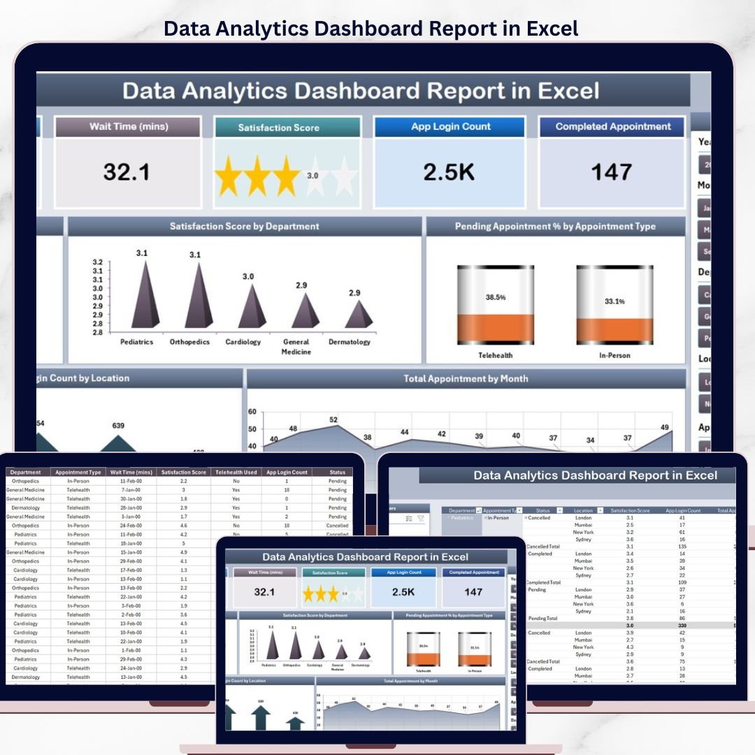 The Data Analytics Dashboard Report tracks 5 headline appointment KPIs: Cancelled Appointment %, Pending Appointment % by Appointment Type, Satisfaction Score by Department, App Login Count by Location, and Total Appointment by Month. All five refresh automatically when you replace the sample data on the Data sheet.