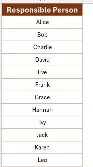✨ Drop-Down Lists – The “Responsible Person” column is powered by a unique list sheet, ensuring consistency and reducing data entry errors.