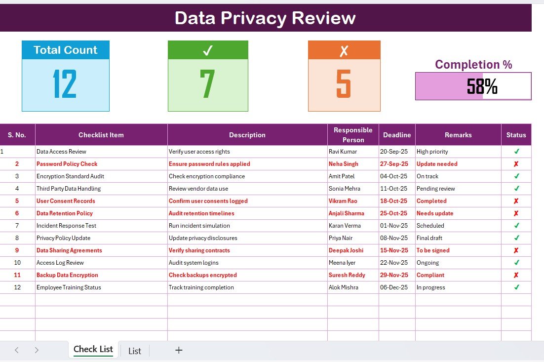 In today’s digital era, Data Privacy Review Checklist in Excel for organizations. From customer information and employee records to financial details, businesses collect and store massive volumes of sensitive data every day. While this data fuels growth and decision-making, it also creates serious risks. A single data breach or compliance violation can lead to fines, reputational damage, and loss of customer trust.