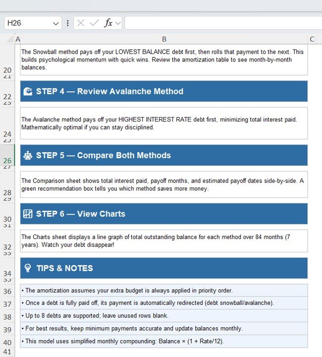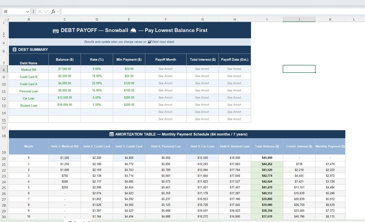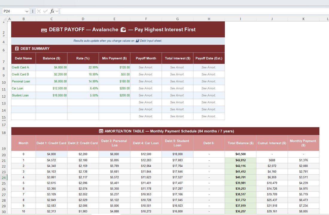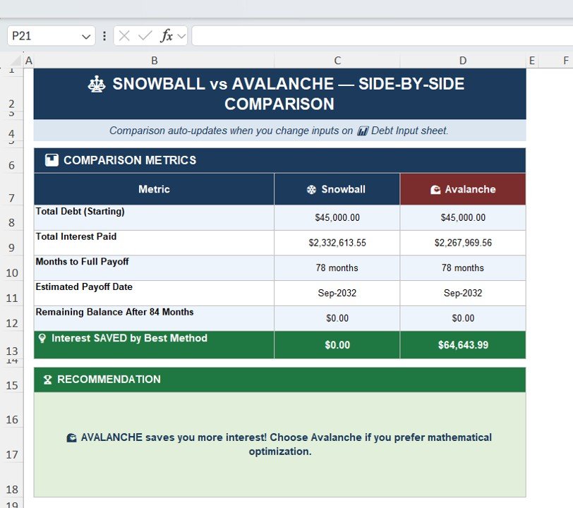 This Excel template automatically calculates debt repayment timelines using two widely recommended strategies: