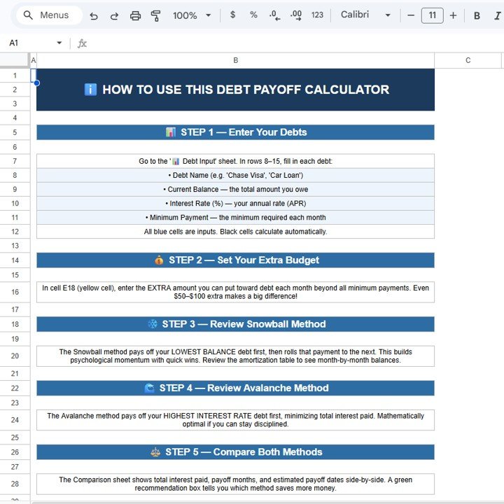 ✔ Debt Input Calculator – Enter all debt details and extra payments.