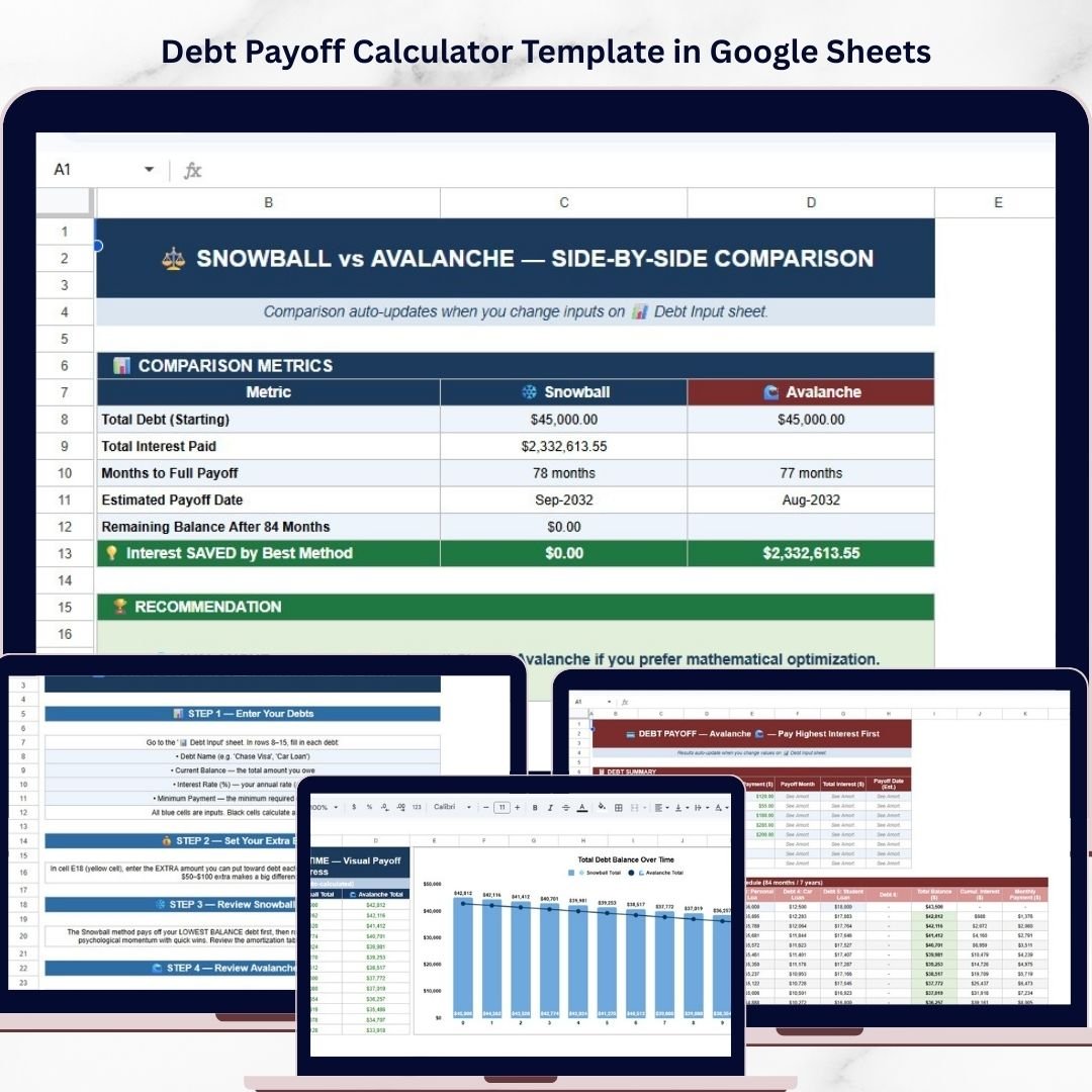 To solve this problem, we created the Debt Payoff Calculator Template in Google Sheets — a powerful and easy-to-use financial planning tool that helps individuals organize their debts, compare repayment strategies, and visualize their progress toward becoming debt-free.