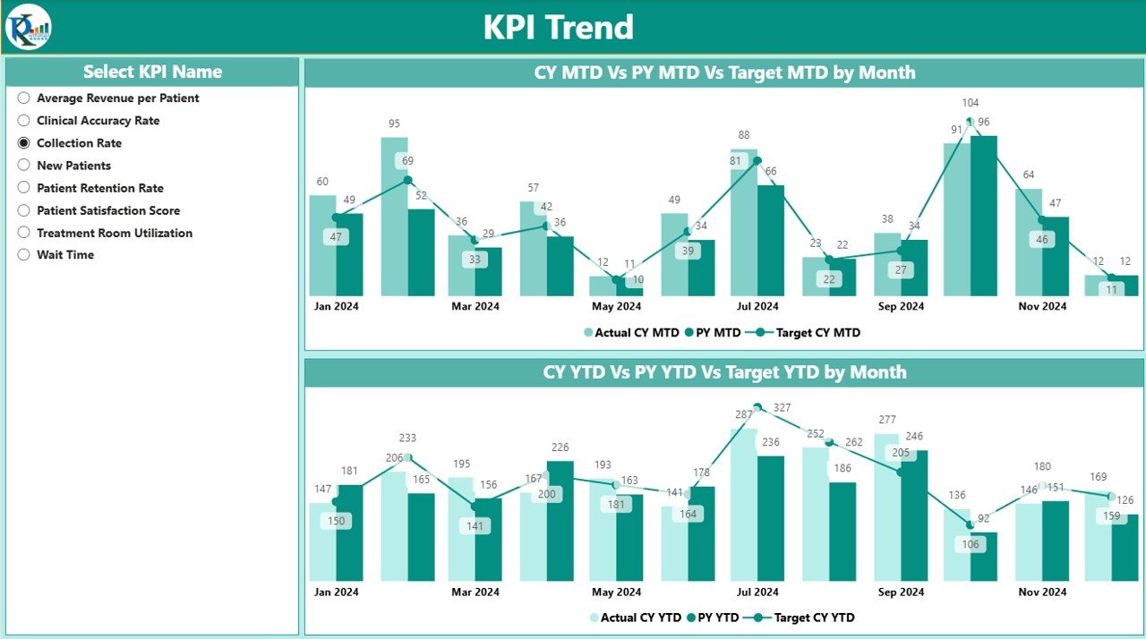 KPI Trend Page – Combo charts showing performance over time (CY, PY, and Targets).