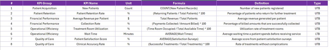 ✅ KPI Definitions – Every metric is transparent with formula, unit, and type (LTB/UTB).