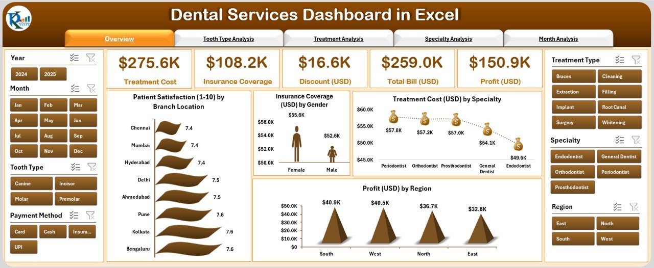 This all-in-one Excel dashboard helps you monitor essential KPIs such as Patient Satisfaction, Treatment Cost, Profit, Insurance Coverage, and Discounts — empowering dentists and clinic managers to make informed decisions with ease.