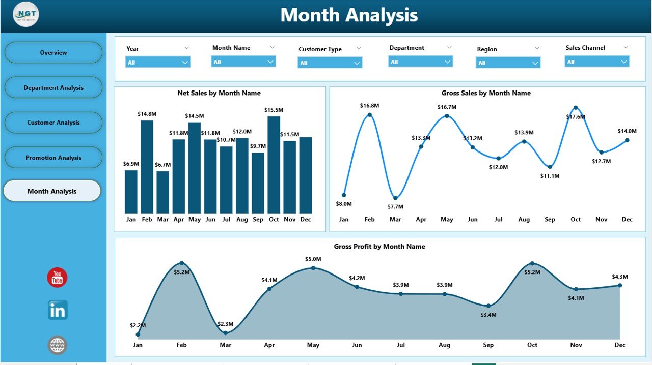 3️⃣ Use slicers to filter by store, region, department, customer type, promotion, or month