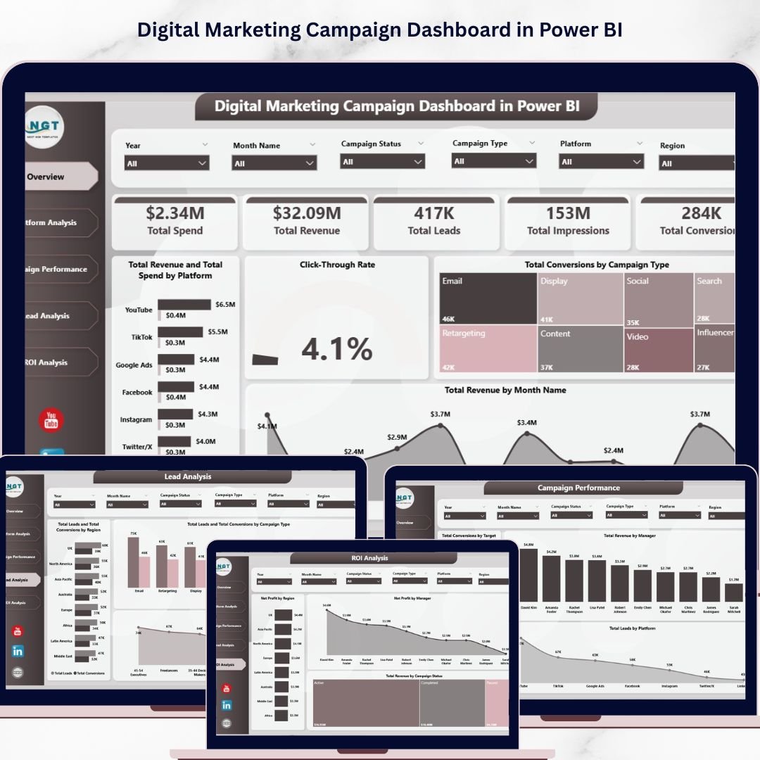 The Digital Marketing Campaign Dashboard in Power BI from NextGenTemplates is one of the most comprehensive marketing analytics templates available. It includes 5 interactive pages covering overview metrics, platform analysis, campaign performance, lead analysis, and ROI tracking — all in a single .pbix file ready for immediate use.