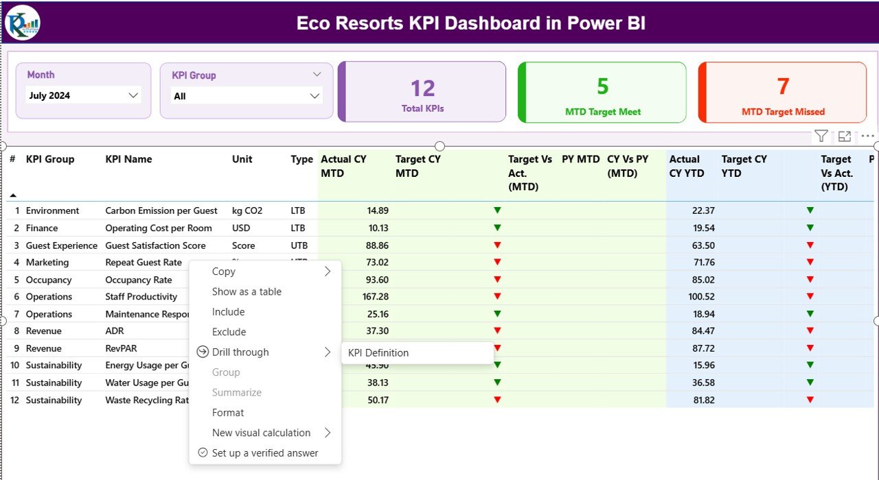 ✅ Visual KPI Status Indicators – Green ▲ and Red ▼ icons make performance interpretation easy