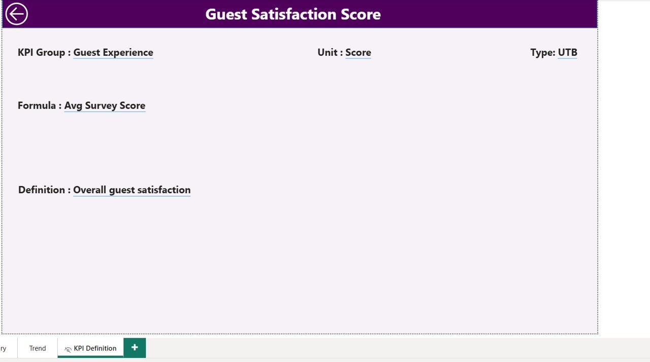 This hidden but powerful page explains each KPI clearly. It includes KPI group, unit, formula, definition, and KPI type (LTB or UTB), ensuring complete transparency.