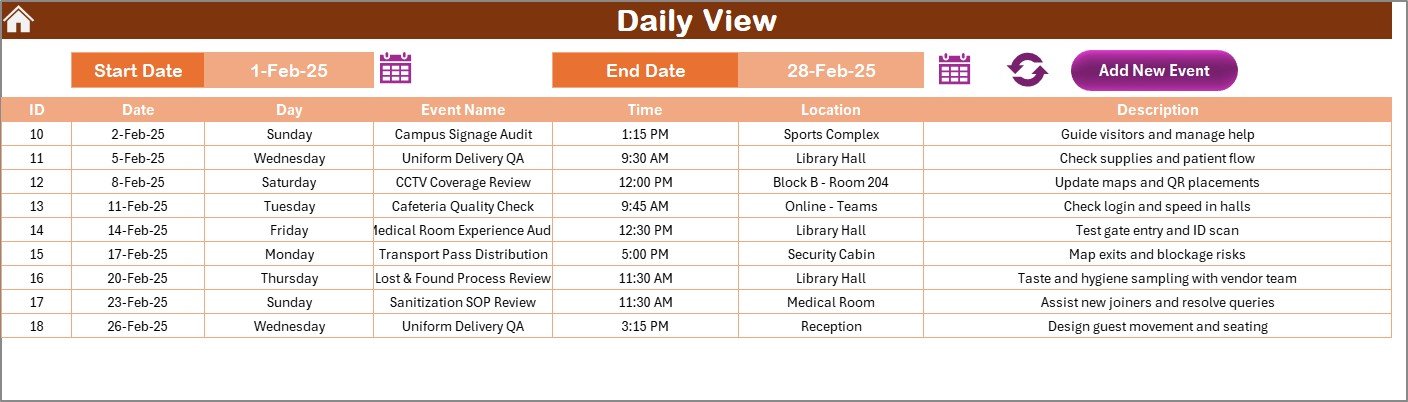 4️⃣ Daily View Sheet – Allows users to filter by date range and view events with details like time, location, and description.