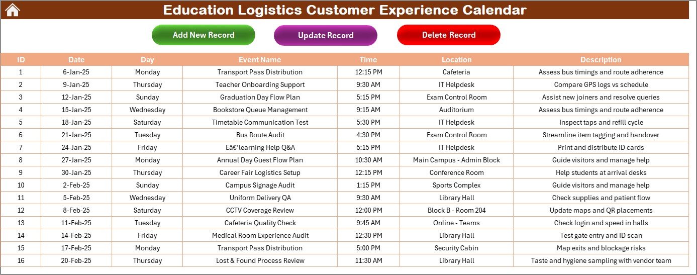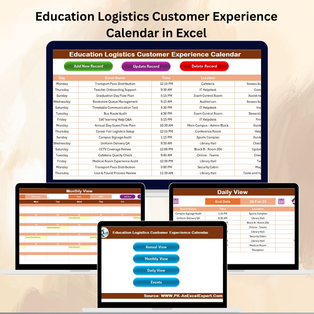 That’s why we created the Education Logistics Customer Experience Calendar in Excel — a ready-to-use, interactive scheduling tool that simplifies planning, enhances communication, and ensures smooth operations. This Excel-based solution is more than just a timetable — it’s a complete logistics and customer experience management system.
