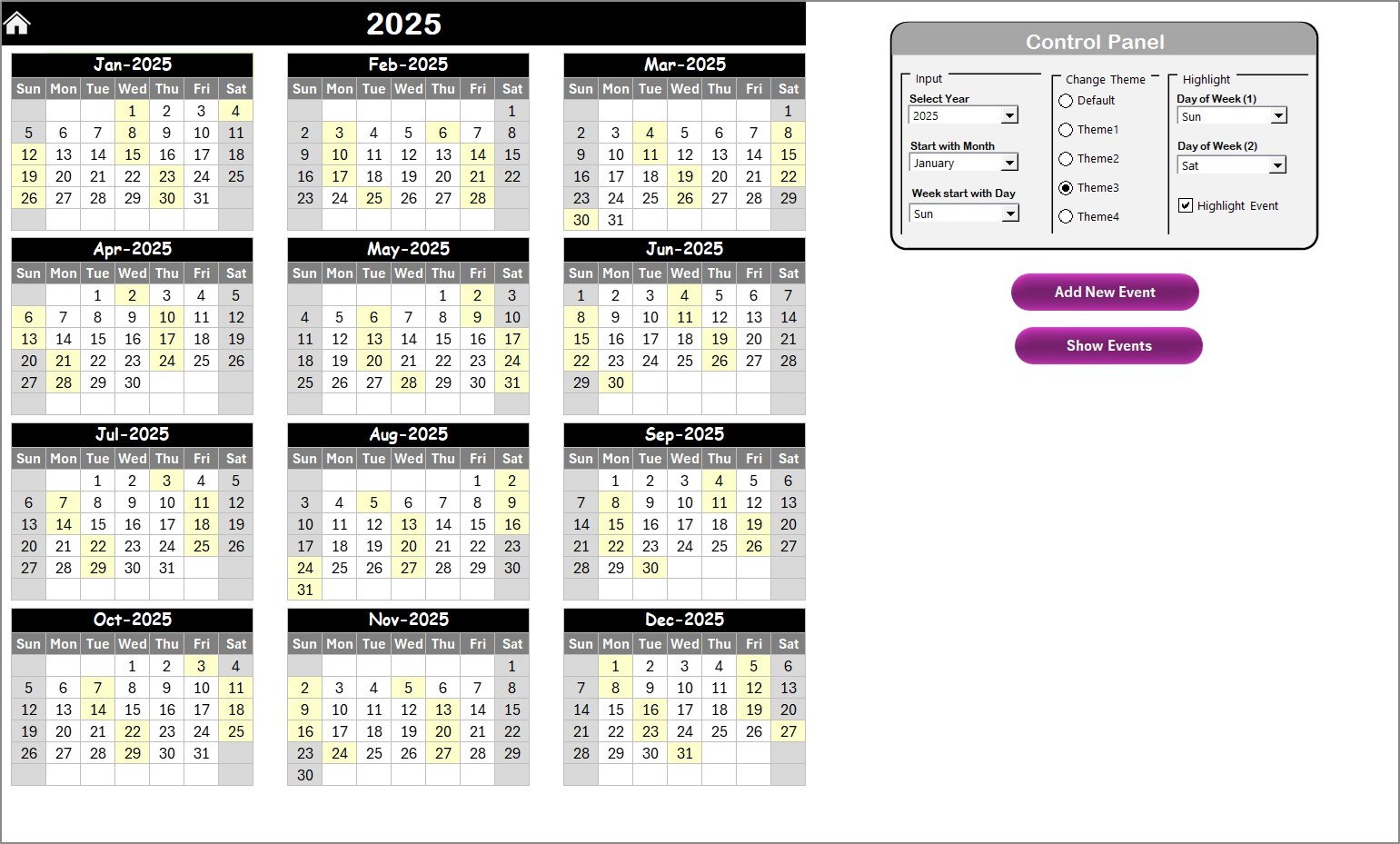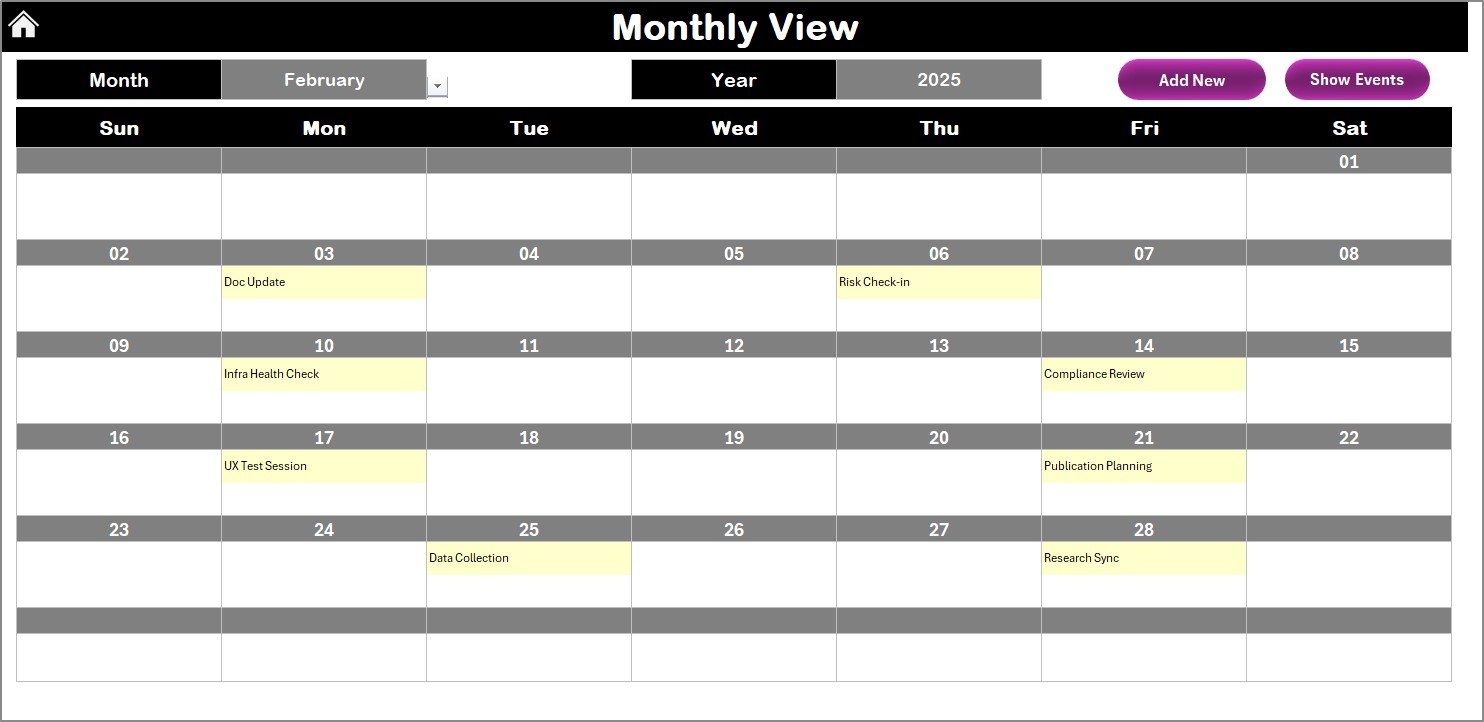 📍 Home Sheet Navigation Hub – Four quick-access buttons to jump directly to the Annual View, Monthly View, Daily View, or Events Database without scrolling through tabs.
