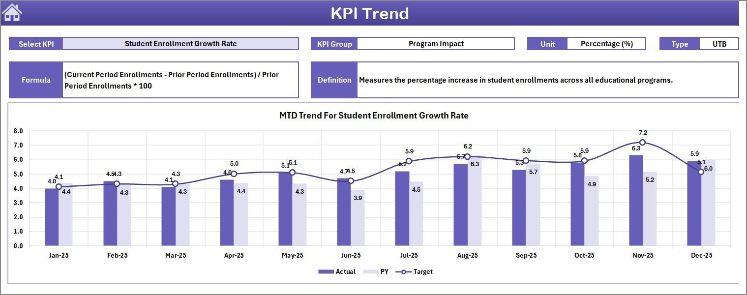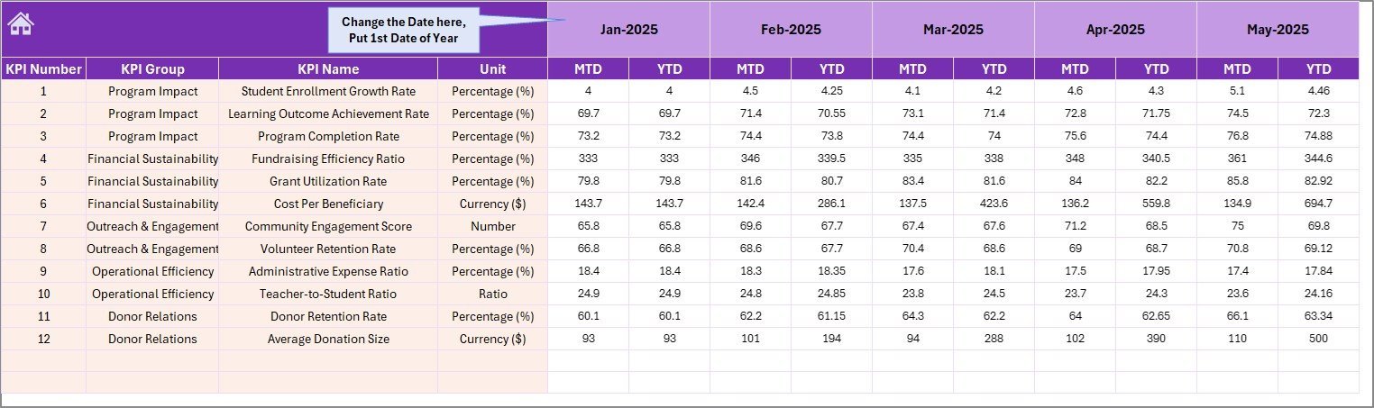LTB means Lower the Better (e.g., dropout rate, cost per student). UTB means Upper the Better (e.g., enrollment rate, graduation rate). This classification determines how conditional formatting arrows display — green for good performance direction, red for bad.Educational NGOs KPI Dashboard in Excel