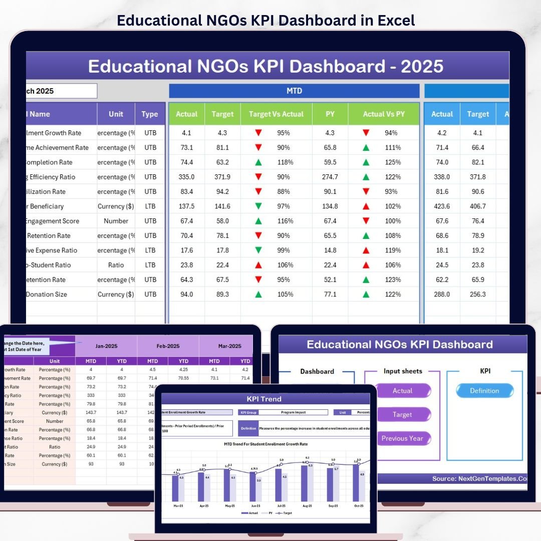 The Educational NGOs KPI Dashboard in Excel tracks 15+ key performance indicators across 7 interactive worksheets, with MTD and YTD trend charts, conditional formatting arrows, and month-over-month comparisons. Setup takes under 10 minutes — just replace the sample data and every metric updates automatically.