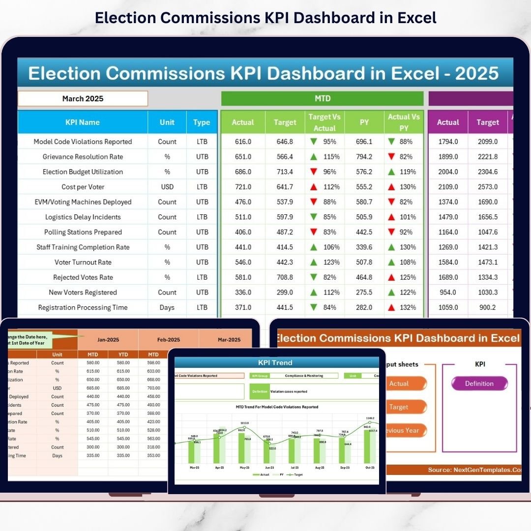 The Election Commissions KPI Dashboard in Excel helps you strengthen transparency, improve operational efficiency, and support data-driven election management.