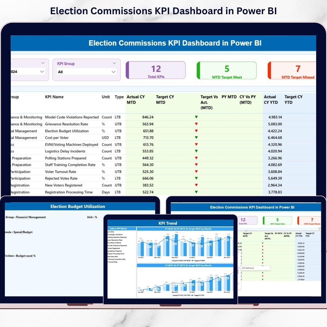 Free, fair, and transparent elections are the foundation of democracy. But managing election performance through scattered spreadsheets and delayed reports can slow down decision-making. What if you could monitor voter registration progress, pollingreadiness, complaint resolution time, and budget utilization — all in one powerful system?Introducing the Election Commissions KPI Dashboard in Power BI — a ready-to-use, fully interactive performance monitoring solution designed specifically for election authorities.This dashboard converts complex election data into clear visuals, KPI indicators, and dynamic reports. With real-time tracking of MTD (Month-To-Date) and YTD (Year-To-Date) performance, leaders can instantly identify gaps, monitor trends, and take corrective action.