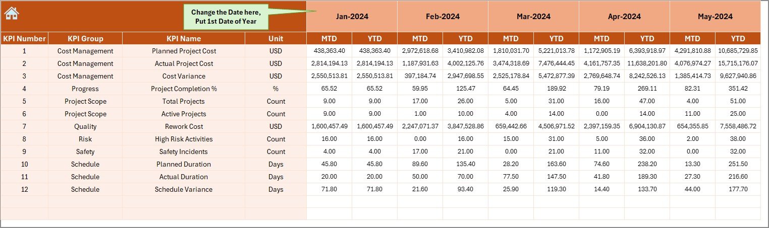 1️⃣ Enter actual project performance data in the Actual Numbers Input Sheet